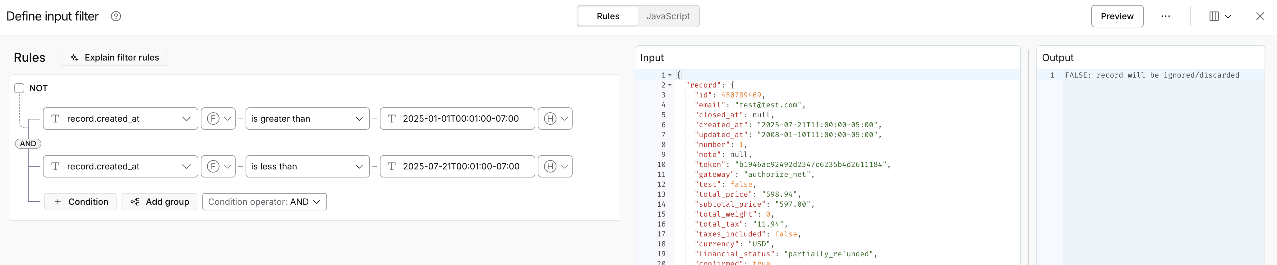 I have checked the filter options but couldn't find a "between" operator. Could you please help us configure the order date filter in the order flow?